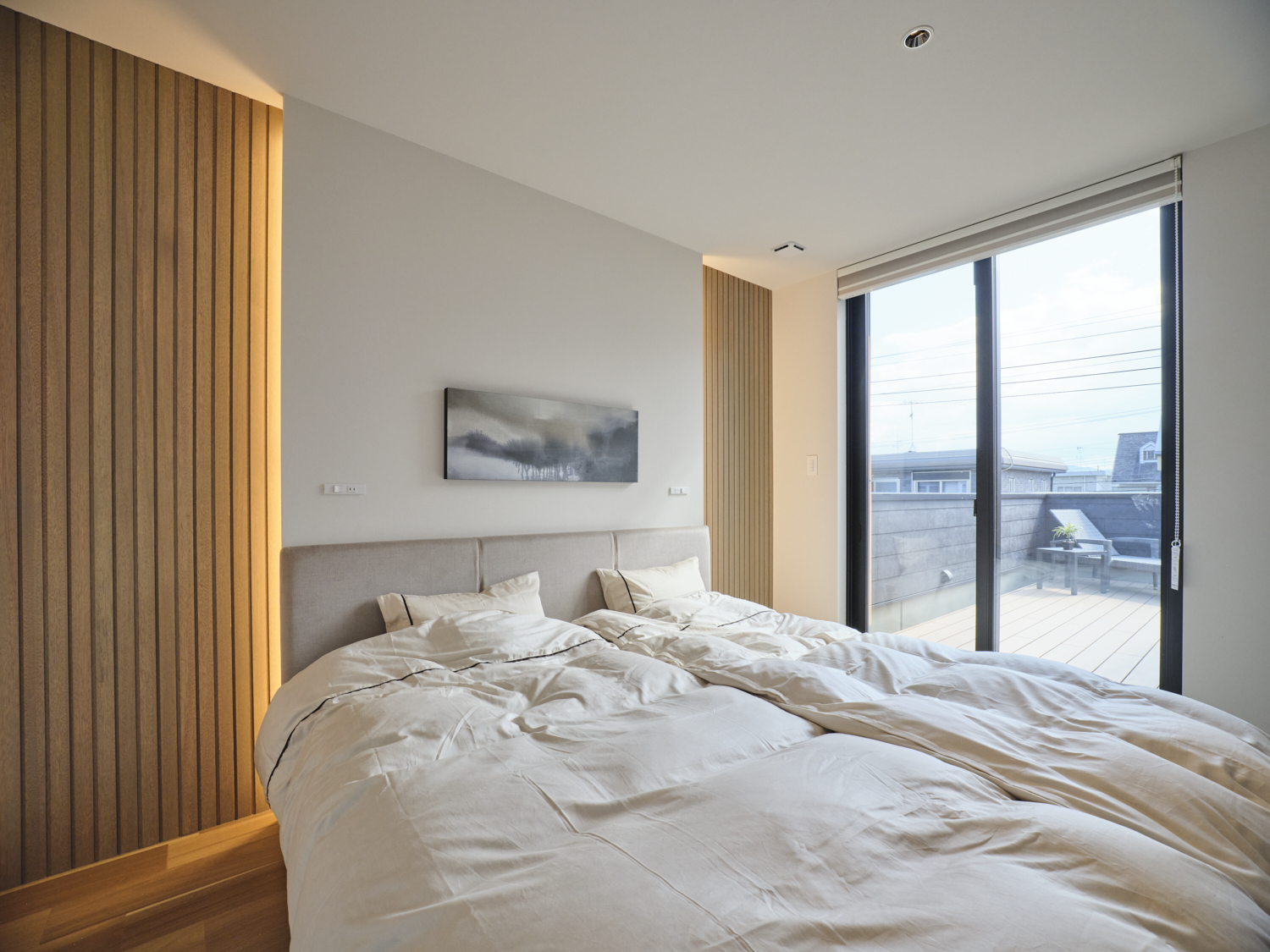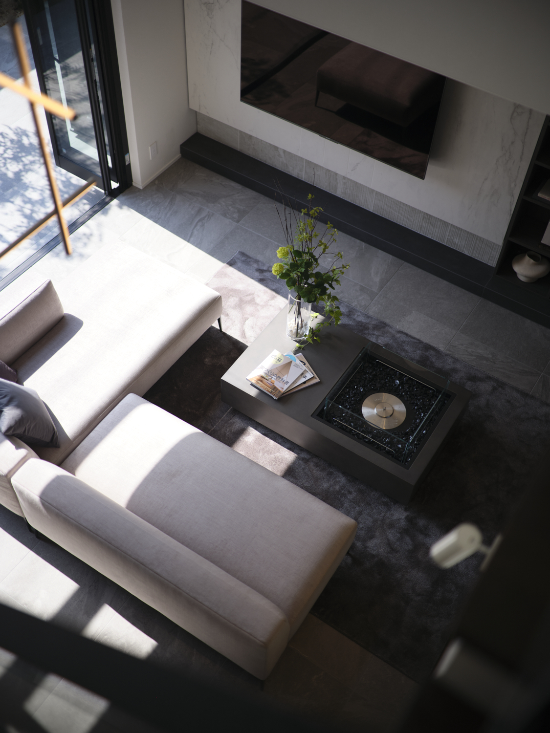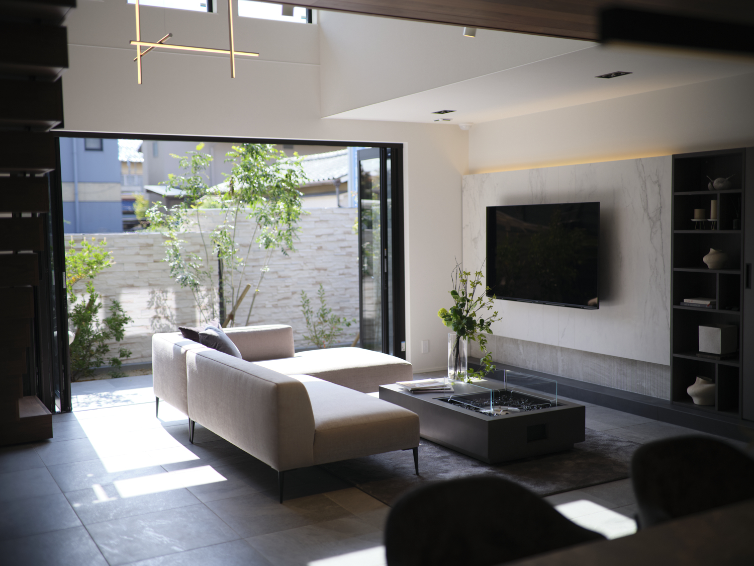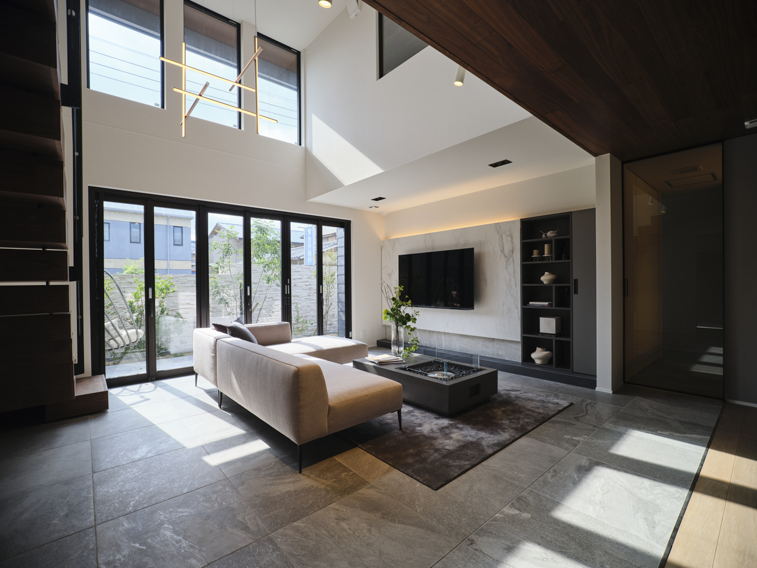 外のテラスとリビングを大開口でつなぐことで、内外が緩やかに溶け合う構成に。まるでホテルラウンジのような上質さと、日常の安らぎが共存する空間を目指しました。床材には重厚感のあるタイルを採用し、天井のウォルナットが落ち着きと温かみを与えます。