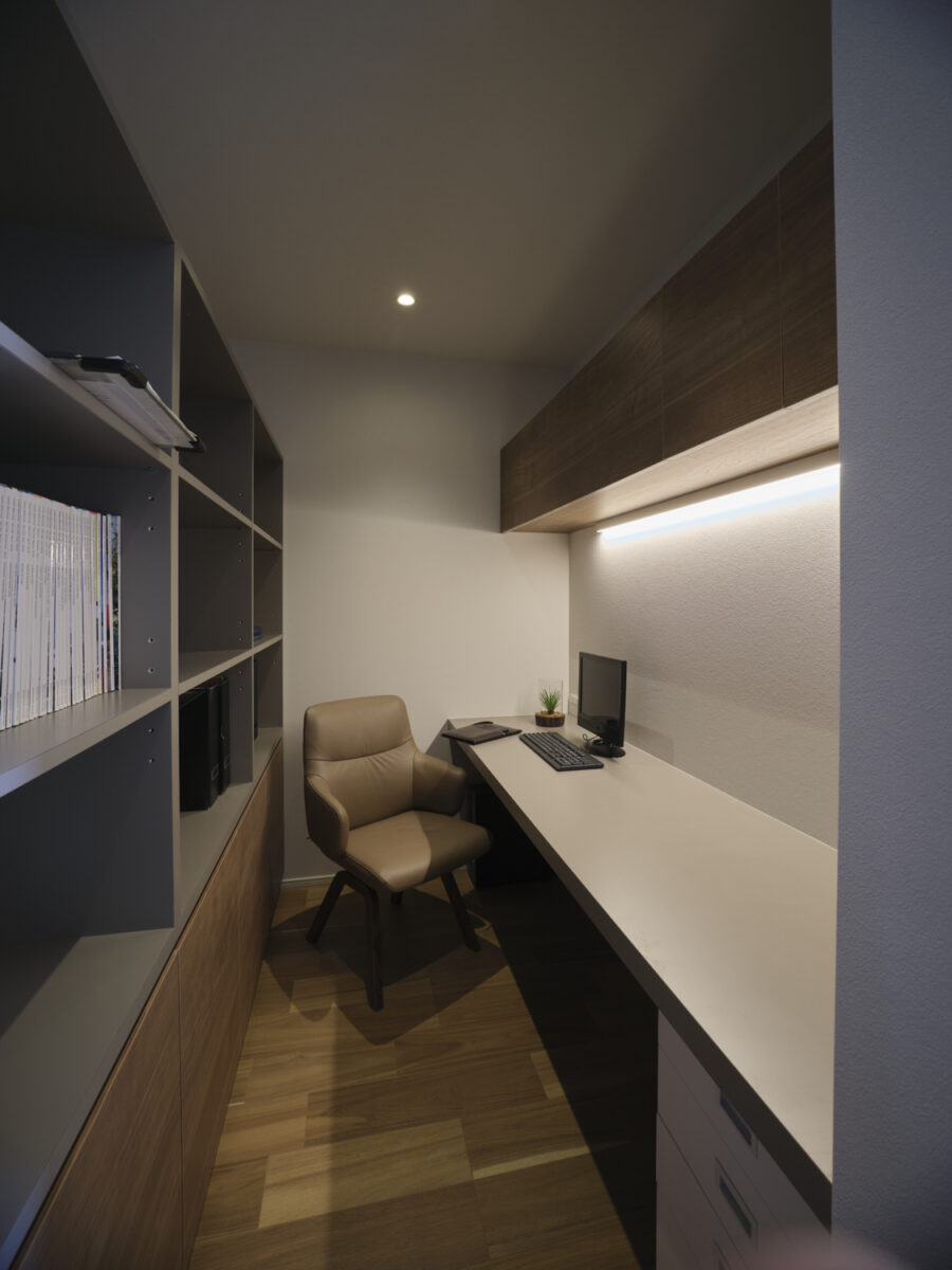 LDKは家族の気配を感じながらも、程よく距離を保てるようにデザインを行いました。キッチンから庭の緑を望み、光のグラデーションが食卓を包み込みます。夜は間接照明が穏やかに壁面を照らし、昼間とは異なる静寂の表情を見せます。