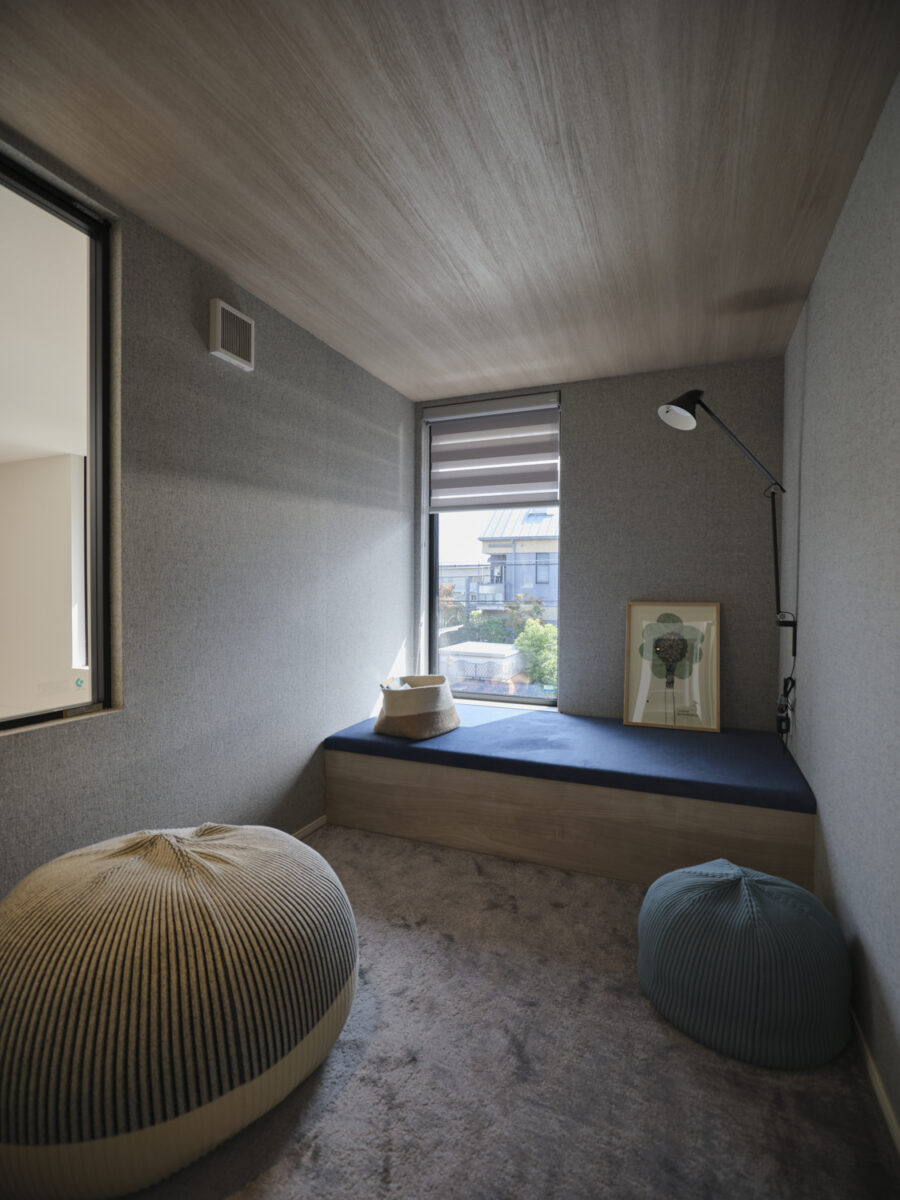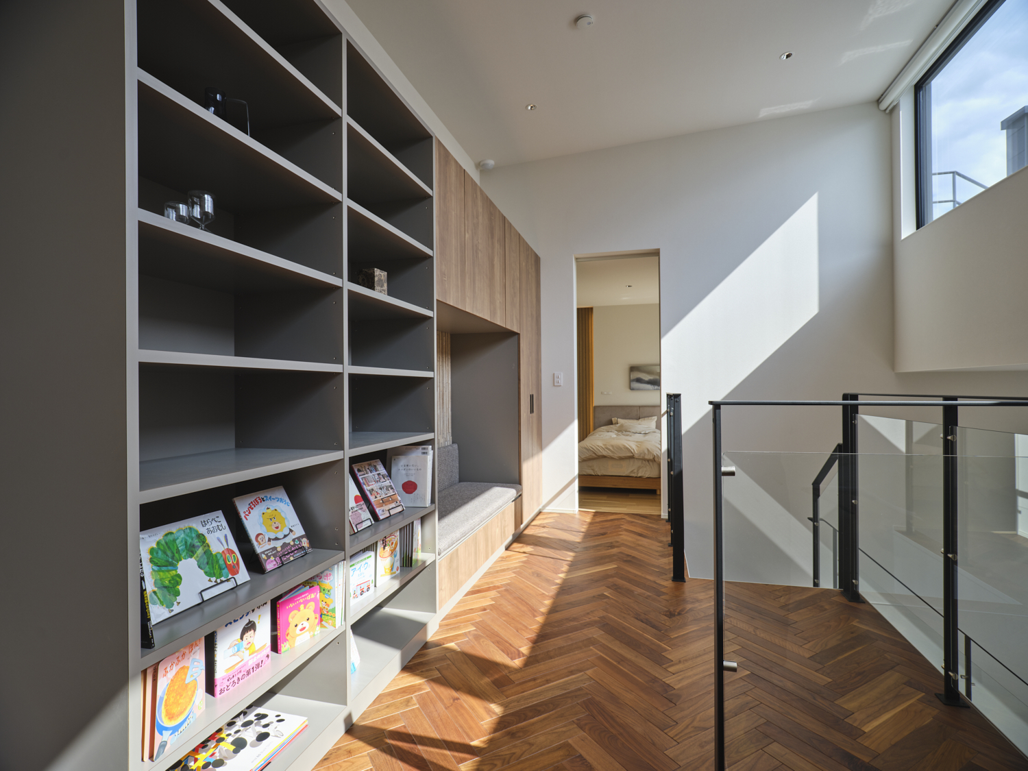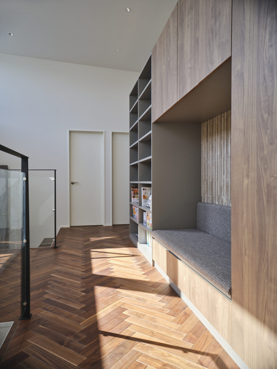 2階は家族それぞれの時間を過ごせるよう、ライブラリーやワークスペースを柔らかく区切りながら配置。ヘリンボーンの床が温かなリズムを生み、素材の重なりが豊かな奥行きを演出します。